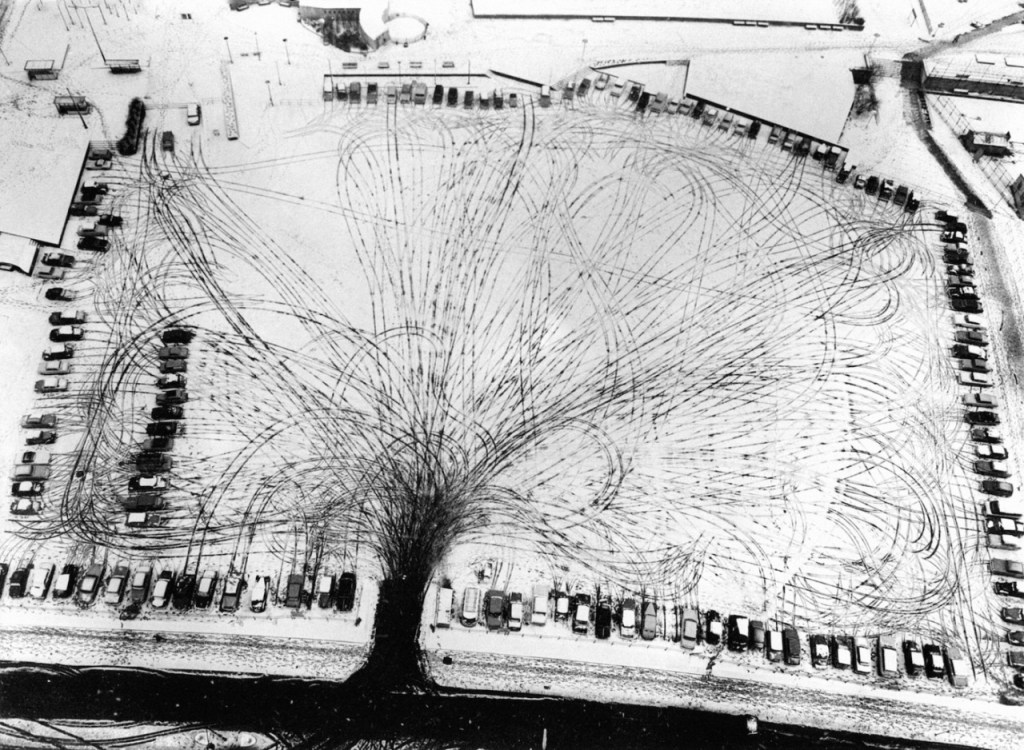 1963 ‘parking lot tree’ tyre tracks in a show covered car park. Via Kottke who later updated his post with another lovely example from Feltron: