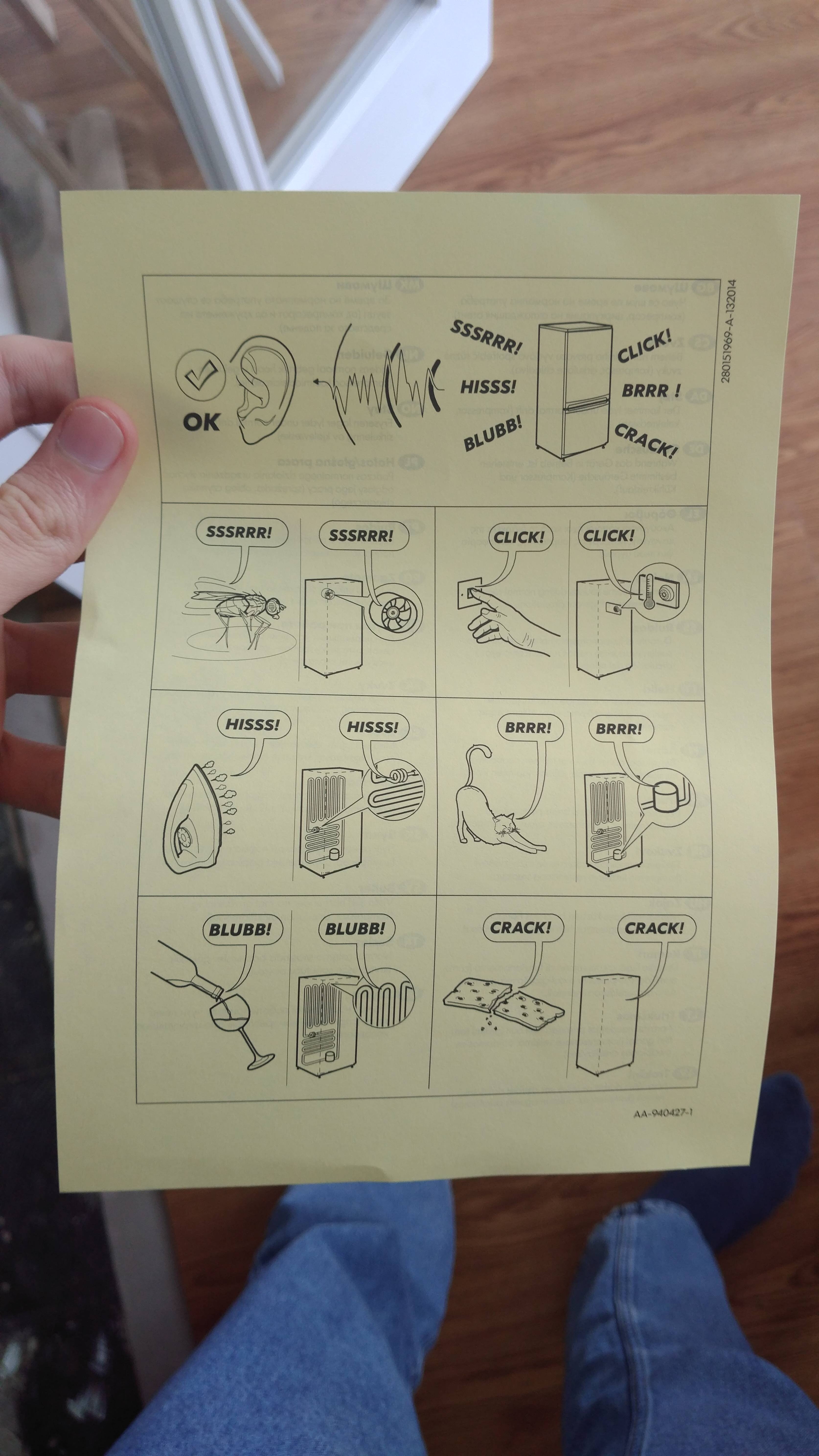 Loving this information sheet included with someones refrigerator, covering all the noises it could make and what they sound like: