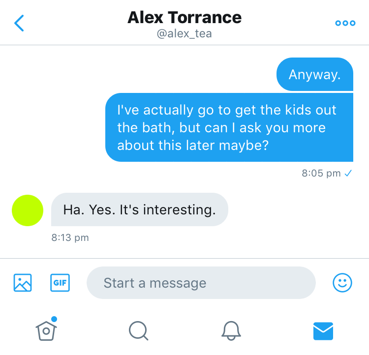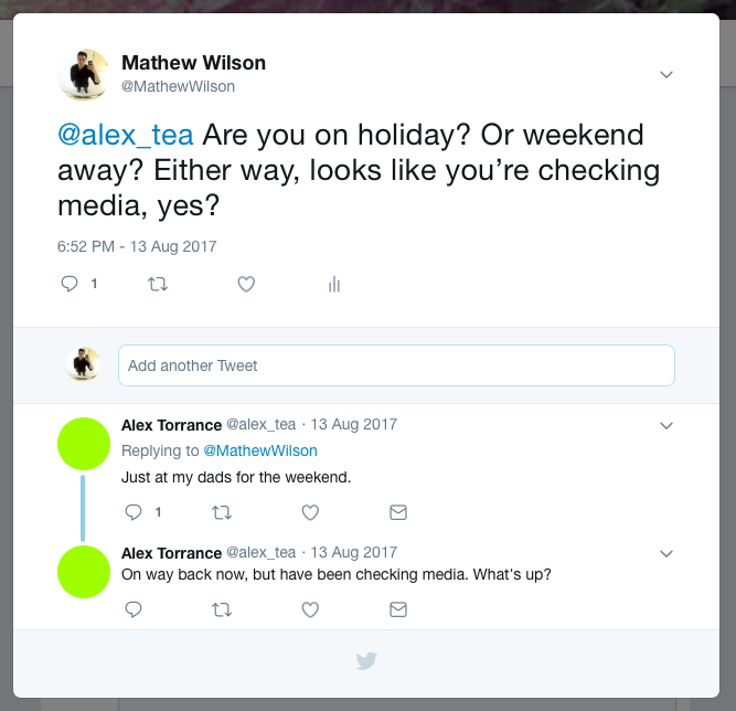 @alex_tea Are you on holiday? Or weekend away? Either way, looks like you’re checking media, yes?