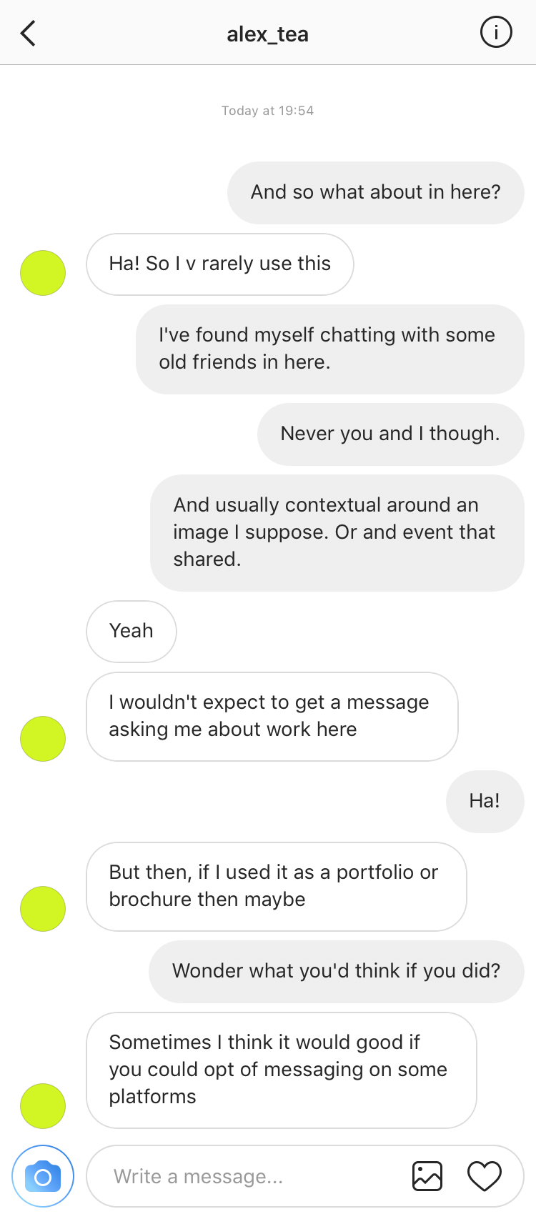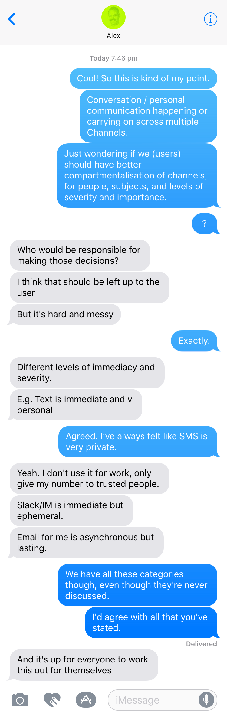 That said, there was something nice about having the conversation and clarifying with Alex how we feel about our shared channels. My social contract with him is now oddly more comfortable, knowing that we’re in each others welcomed SMS circles, and that we’re both tardy with personal email replies… a point which I’m worse on however as since August when Alex last replied, I’ve actually not managed to continue the conversation. Until now. I wonder where it goes next?