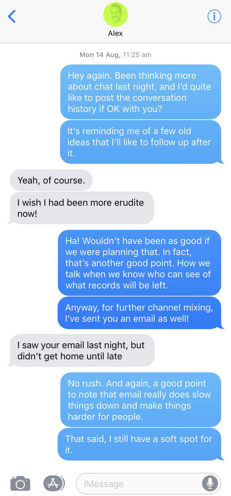 Last August, I had the following conversation with Alex, across 5 different communication channels, and over a couple of weeks. Counting this blog post and the time that had further elapsed since conversation began, that’s 6 channels, and as many months.