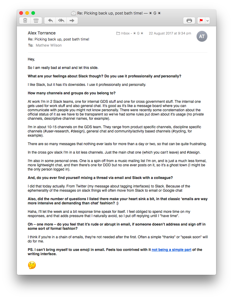 PS. I can’t bring myself to use emoji in email. Feels too contrived with it not being a simple part of the writing interface.